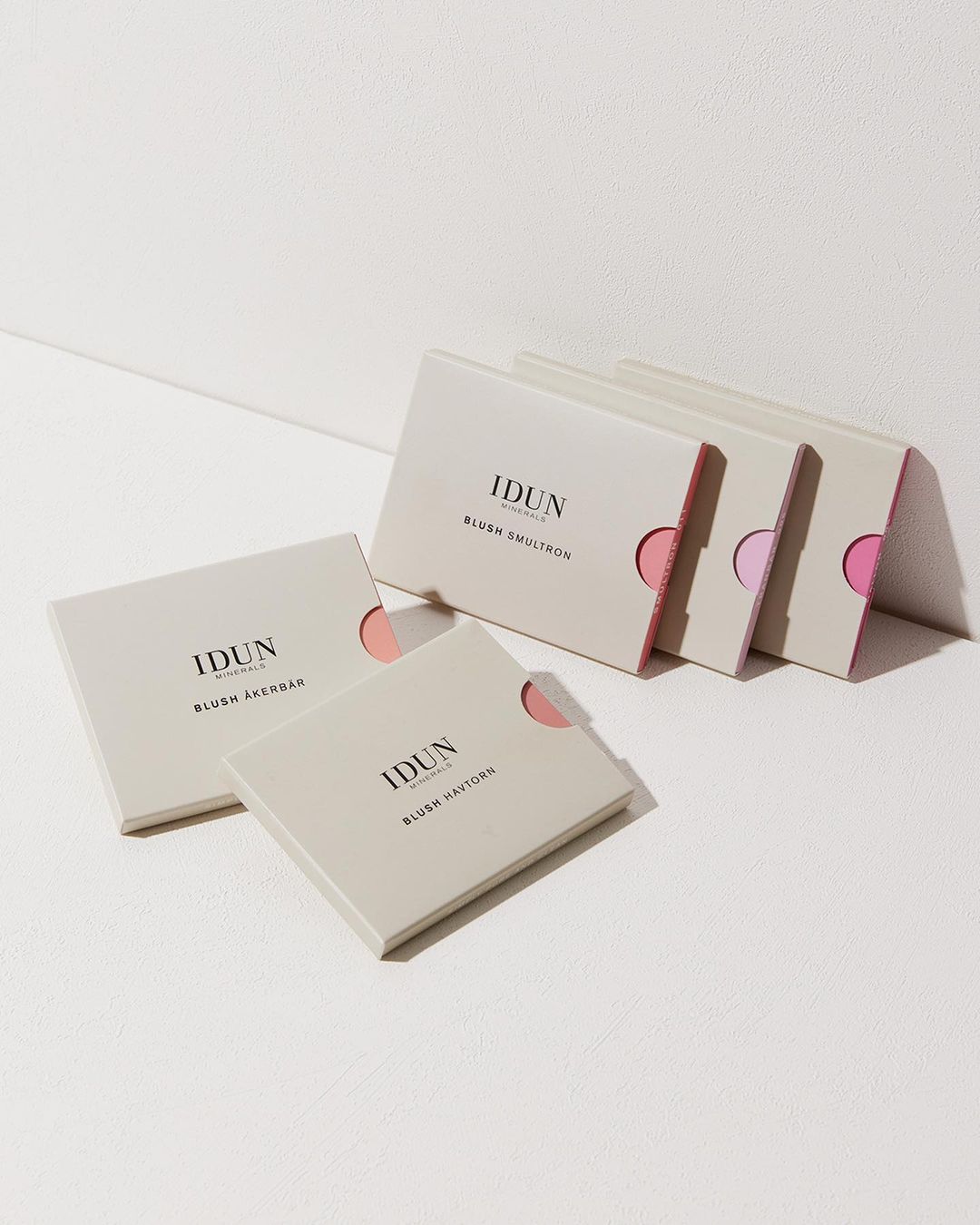 The blush/bronzer packaging is now made in FSC-certified paper. This makes us save 2,27 tons of non-recyclable plastic per year*. The metal pan is designed for easy separation – simply press the bottom to release it, then sort as metal and paper. In spring 2023 we did carbon emission calculations together with U&We, the study showed that the European paper compact had approximately 75% less climate emissions compared to the Asian plastic compact.